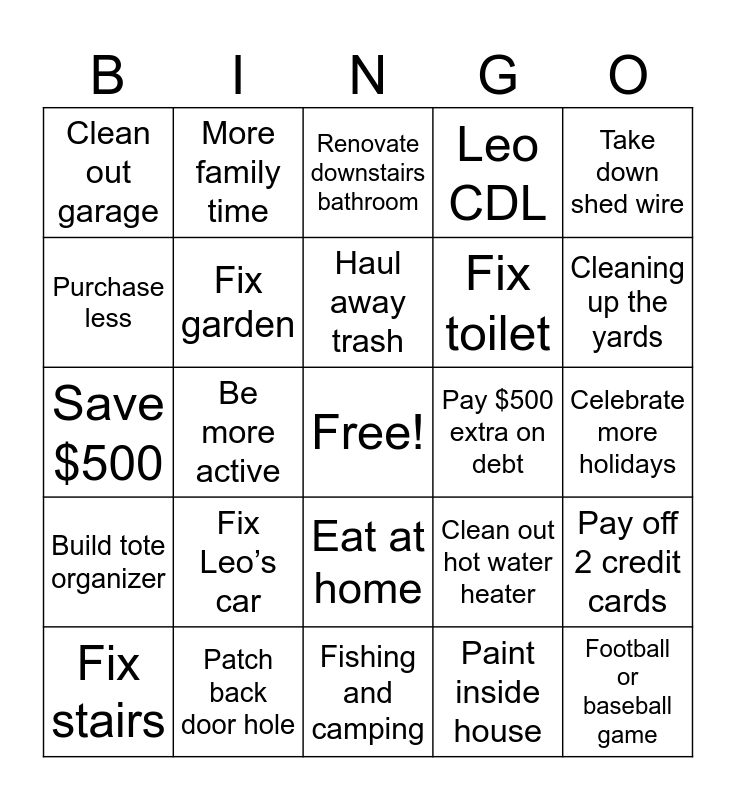 This bingo card has a free space and 24 words: Fix stairs, Fix Leo’s car, Haul away trash, Paint inside house, Take down shed wire, Clean out garage, More family time, Renovate downstairs bathroom, Pay $500 extra on debt, Celebrate more holidays, Save $500, Fix garden, Clean out hot water heater, Pay off 2 credit cards, Purchase less, Patch back door hole, Fishing and camping, Leo CDL, Cleaning up the yards, Build tote organizer, Be more active, Eat at home, Fix toilet and Football or baseball game.