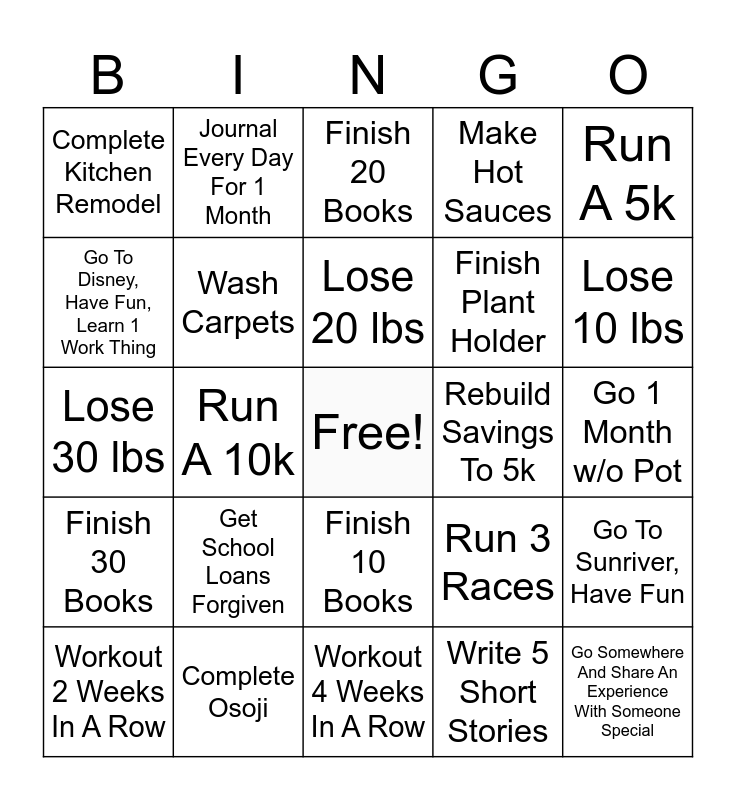 This bingo card has a free space and 24 words: Get School Loans Forgiven, Complete Osoji, Lose 20 lbs, Workout 2 Weeks In A Row, Run A 5k, Complete Kitchen Remodel, Go To Disney, Have Fun, Learn 1 Work Thing, Journal Every Day For 1 Month, Rebuild Savings To 5k, Finish 10 Books, Finish Plant Holder, Lose 30 lbs, Run 3 Races, Go To Sunriver, Have Fun, Wash Carpets, Write 5 Short Stories, Go 1 Month w/o Pot, Finish 20 Books, Lose 10 lbs, Run A 10k, Go Somewhere And Share An Experience With Someone Special, Finish 30 Books, Make Hot Sauces and Workout 4 Weeks In A Row.