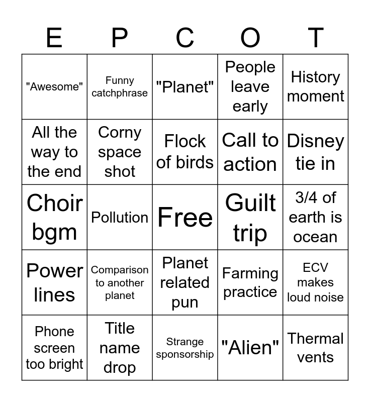 This bingo card has a free space and 30 words: Title name drop, Celebrity narrator, Pollution, Recycling, "Awesome", "Planet", Corny space shot, Planet related pun, Guilt trip, Strange sponsorship, 3/4 of earth is ocean, Thermal vents, "Alien", Heli-cam shot, Disney tie in, Extreme weather, Farming practice, Power lines, Comparison to another planet, History moment, Choir bgm, Space music, Funny catchphrase, Call to action, All the way to the end, People leave early, ECV makes loud noise, Phone screen too bright, Flock of birds and Epcot name drop.