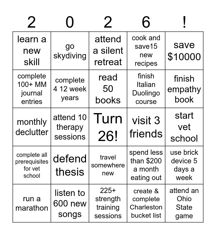 This bingo card has a free space and 24 words: defend thesis, listen to 600 new songs, read 50 books, run a marathon, save $10000, learn a new skill, complete 100+ MM journal entries, go skydiving, visit 3 friends, travel somewhere new, finish Italian Duolingo course, monthly declutter, spend less than $200 a month eating out, use brick device 5 days a week, complete 4 12 week years, create & complete Charleston bucket list, start vet school, attend a silent retreat, finish empathy book, attend 10 therapy sessions, attend an Ohio State game, complete all prerequisites for vet school, cook and save15 new recipes and 225+ strength training sessions.