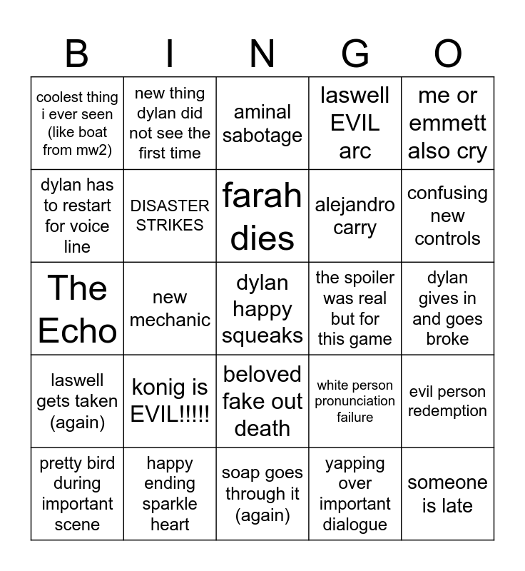 This bingo card has a free space and 24 words: konig is EVIL!!!!!, happy ending sparkle heart, farah dies, pretty bird during important scene, me or emmett also cry, coolest thing i ever seen (like boat from mw2), dylan has to restart for voice line, new thing dylan did not see the first time, the spoiler was real but for this game, beloved fake out death, alejandro carry, The Echo, white person pronunciation failure, evil person redemption, DISASTER STRIKES, yapping over important dialogue, dylan gives in and goes broke, aminal sabotage, confusing new controls, new mechanic, someone is late, laswell gets taken (again), laswell EVIL arc and soap goes through it (again).