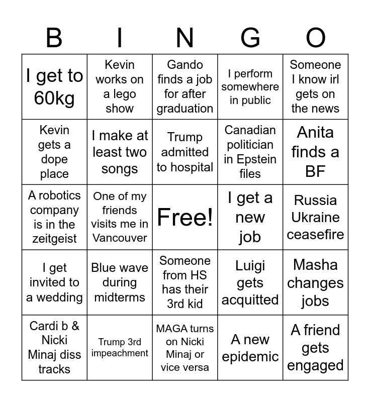 This bingo card has a free space and 24 words: Blue wave during midterms, Trump 3rd impeachment, Trump admitted to hospital, Cardi b & Nicki Minaj diss tracks, Someone I know irl gets on the news, I get to 60kg, Kevin gets a dope place, Kevin works on a lego show, I get a new job, Someone from HS has their 3rd kid, Canadian politician in Epstein files, A robotics company is in the zeitgeist, Luigi gets acquitted, Masha changes jobs, I make at least two songs, A new epidemic, Russia Ukraine ceasefire, Gando finds a job for after graduation, Anita finds a BF, One of my friends visits me in Vancouver, A friend gets engaged, I get invited to a wedding, I perform somewhere in public and MAGA turns on Nicki Minaj or vice versa.