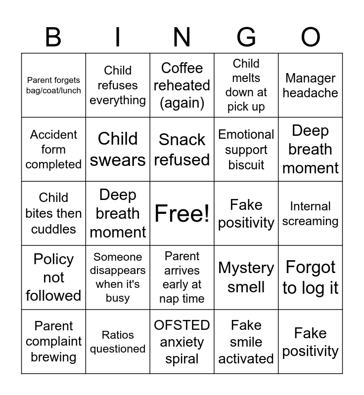 This bingo card has a free space and 77 words: "I've just cleaned that", "They never do this at home", Coffee reheated (again), Lost dummy, Ofsted mentioned, Parent late again, Nappy explosion, Policy challenged, Whatsapp drama, "Can you just", Child strips off, Sudden silence, Snack refused, Accident form completed, Phone spotted, Deep breath moment, End of day exhaustion, Fake positivity, Team tension, Manager headache, Child screams for no reason, Child bites then cuddles, Child swears, Child refuses everything, Child melts down at pick up, Child falls over dramatically, Child says something brutally honest, Child hides during tidy up, Child runs when you say "Stop!", Child cries then laughs, Parent late again, Handover missed, Fire drill panic, Mystery smell, Deep breath moment, Emotional support biscuit, Burnout moment, End of day exhaustion, Internal screaming, Fake smile activated, Team tension, Morale dip, Survival mode engaged, Everyone needs wine, Essay length parent message, Over familiar parent, Parent complaint brewing, Parent forgets bag/coat/lunch, Parent wants a "Quick word", Parent disagrees with policy, Parent contradicts staff in front of child, Parent arrives early at nap time, Coffee goes cold, Passive aggressive message, Someone avoids a task, "That's not my job", Someone challenges a decision, Phone spotted on the floor, Staff eye rolling spotted, Silent rage cleaning, Someone disappears when it's busy, Authority challenged, Leadership patience tested, Someone goes over heads, Someone undermines leadership, Too many opinions, Micromanaging moment, Fake positivity, "We'll reflect on that", Another meeting scheduled, Accident Form (again), Forgot to log it, Policy not followed, Ratios questioned, OFSTED mentioned, OFSTED anxiety spiral and Missing paperwork.