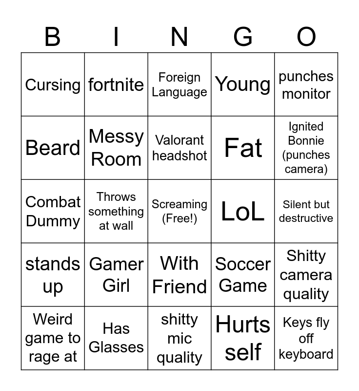 This bingo card has a free space and 24 words: Gamer Girl, Has Glasses, Valorant headshot, Weird game to rage at, punches monitor, Cursing, Beard, fortnite, LoL, With Friend, Fat, Combat Dummy, Soccer Game, Shitty camera quality, Messy Room, Hurts self, Silent but destructive, Foreign Language, Ignited Bonnie (punches camera), Throws something at wall, Keys fly off keyboard, stands up, Young and shitty mic quality.