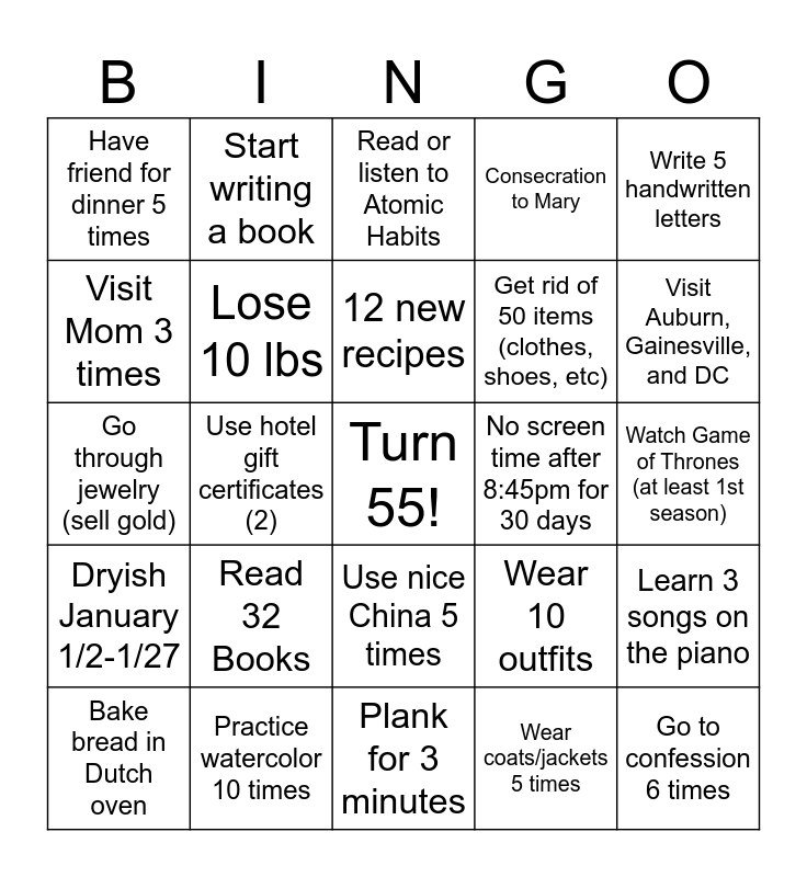 This bingo card has a free space and 24 words: Read 32 Books, Practice watercolor 10 times, 12 new recipes, Bake bread in Dutch oven, Write 5 handwritten letters, Have friend for dinner 5 times, Visit Mom 3 times, Start writing a book, No screen time after 8:45pm for 30 days, Use nice China 5 times, Get rid of 50 items (clothes, shoes, etc), Go through jewelry (sell gold), Wear 10 outfits, Learn 3 songs on the piano, Lose 10 lbs, Wear coats/jackets 5 times, Watch Game of Thrones (at least 1st season), Read or listen to Atomic Habits, Visit Auburn, Gainesville, and DC, Use hotel gift certificates (2), Go to confession 6 times, Dryish January 1/2-1/27, Consecration to Mary and Plank for 3 minutes.