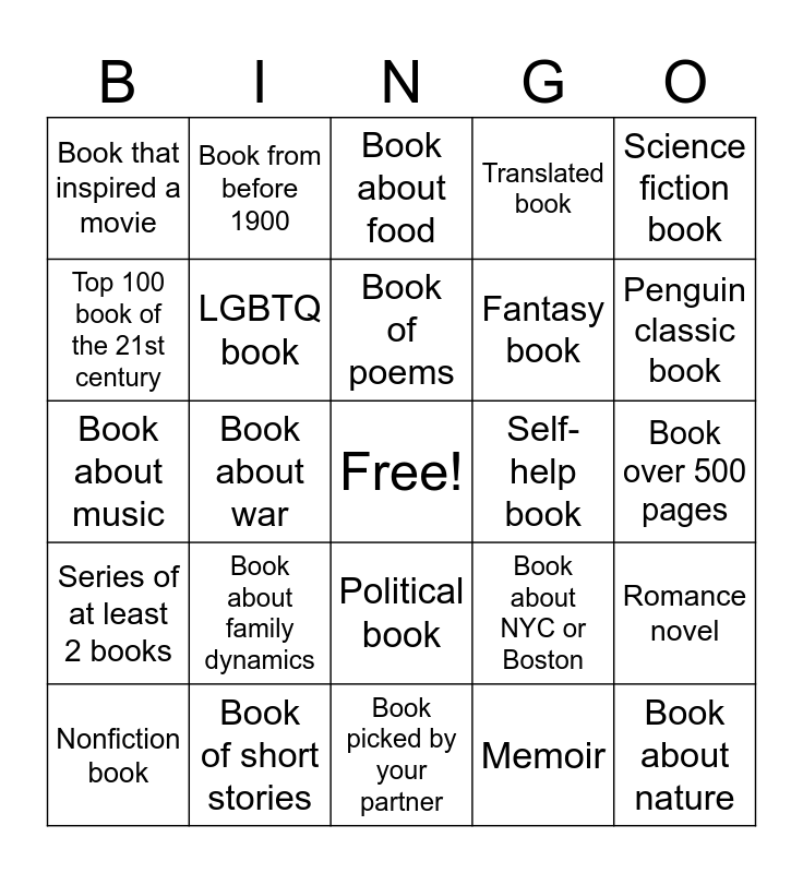 This bingo card has a free space and 24 words: Book about family dynamics, Book of short stories, Book of poems, Nonfiction book, Science fiction book, Book that inspired a movie, Top 100 book of the 21st century, Book from before 1900, Self-help book, Political book, Fantasy book, Book about music, Book about NYC or Boston, Romance novel, LGBTQ book, Memoir, Book over 500 pages, Book about food, Penguin classic book, Book about war, Book about nature, Series of at least 2 books, Translated book and Book picked by your partner.