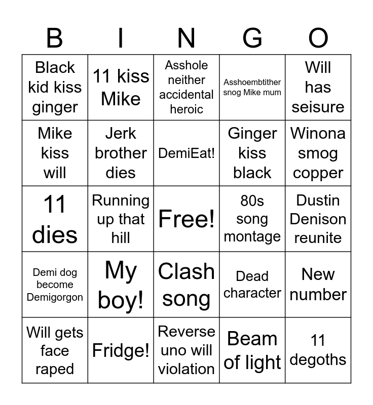 This bingo card has a free space and 24 words: My boy!, Fridge!, DemiEat!, Will gets face raped, Will has seisure, Black kid kiss ginger, Mike kiss will, 11 kiss Mike, 80s song montage, Clash song, Ginger kiss black, 11 dies, Dead character, New number, Jerk brother dies, Beam of light, Dustin Denison reunite, Asshole neither accidental heroic, Winona smog copper, Running up that hill, 11 degoths, Demi dog become Demigorgon, Asshoembtither snog Mike mum and Reverse uno will violation.