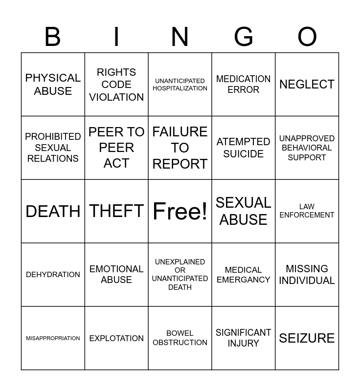 This bingo card has a free space and 24 words: EMOTIONAL ABUSE, EXPLOTATION, FAILURE TO REPORT, MISAPPROPRIATION, NEGLECT, PHYSICAL ABUSE, PROHIBITED SEXUAL RELATIONS, RIGHTS CODE VIOLATION, SEXUAL ABUSE, UNEXPLAINED OR UNANTICIPATED DEATH, ATEMPTED SUICIDE, DEATH, MEDICAL EMERGANCY, MISSING INDIVIDUAL, PEER TO PEER ACT, SIGNIFICANT INJURY, LAW ENFORCEMENT, UNANTICIPATED HOSPITALIZATION, UNAPPROVED BEHAVIORAL SUPPORT, THEFT, SEIZURE, DEHYDRATION, MEDICATION ERROR and BOWEL OBSTRUCTION.