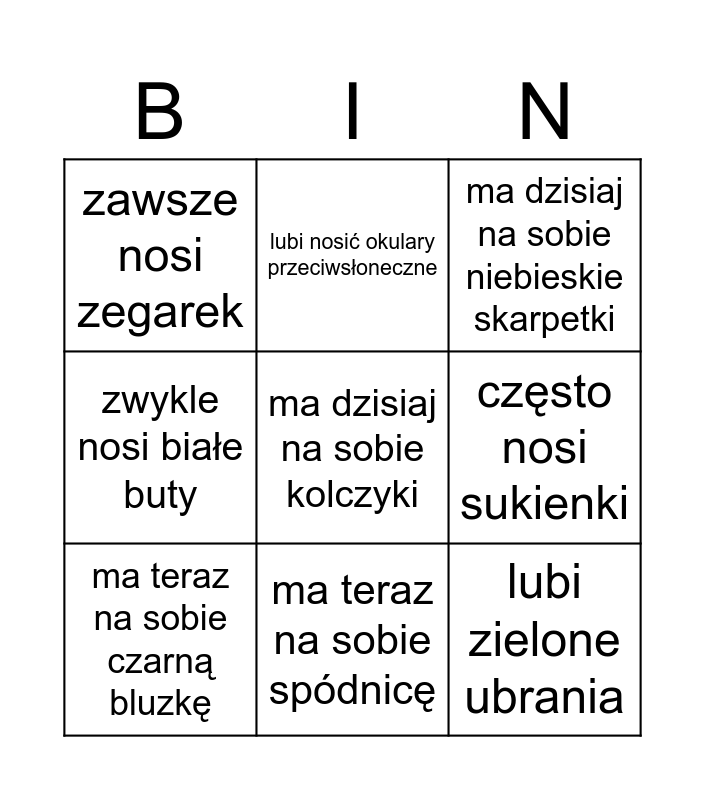 This bingo card has a free space and 8 words: często nosi sukienki, ma dzisiaj na sobie niebieskie skarpetki, lubi nosić okulary przeciwsłoneczne, ma teraz na sobie czarną bluzkę, zawsze nosi zegarek, lubi zielone ubrania, zwykle nosi białe buty and ma teraz na sobie spódnicę.