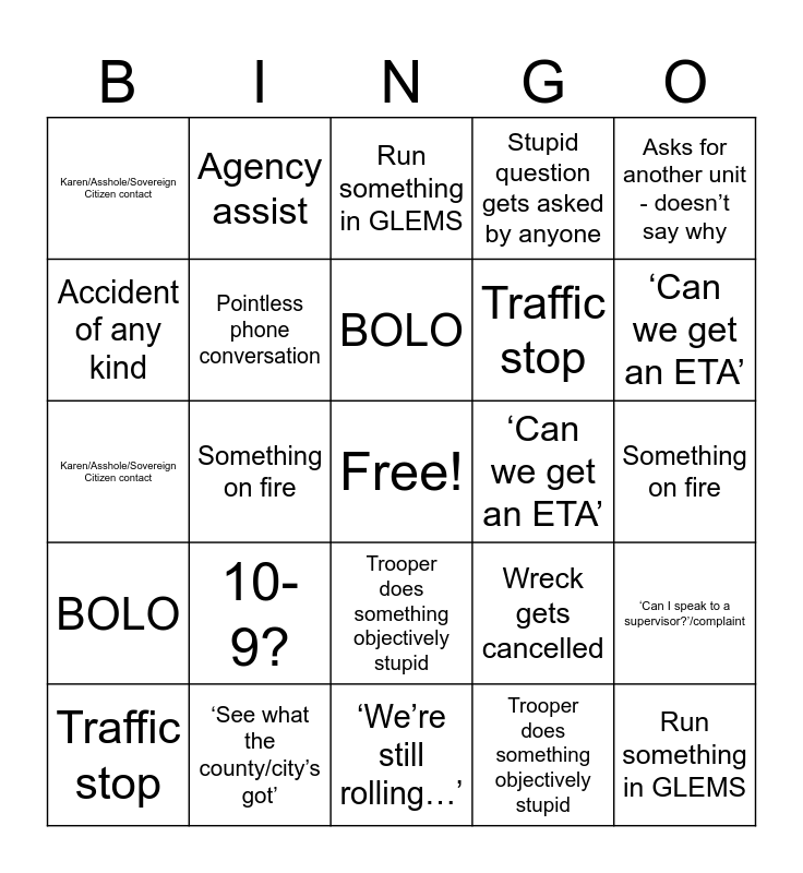 This bingo card has a free space and 48 words: ‘Catching up to one’, Run something in GLEMS, 10-80, ‘We’re still rolling…’, 10-9?, Doesn’t answer status check, Agency assist, CAD issue, Accident of any kind, 10-96, Pointless phone conversation, Stupid question gets asked by anyone, ‘Can I speak to a supervisor?’/complaint, Wreck gets cancelled, ‘See what the county/city’s got’, 10-55, BOLO, ‘Can we get an ETA’, Spam phone call, Asks for another unit - doesn’t say why, Something on fire, Trooper does something objectively stupid, Karen/Asshole/Sovereign Citizen contact, Traffic stop, 10-96, ‘Can we get an ETA’, Traffic stop, ‘We’re still rolling…’, Trooper does something objectively stupid, BOLO, Doesn’t answer status check, Spam phone call, Wreck gets cancelled, ‘Catching up to one’, ‘See what the county/city’s got’, 10-55, ‘Can I speak to a supervisor?’/complaint, Something on fire, Stupid question gets asked by anyone, Agency assist, CAD issue, 10-9?, Run something in GLEMS, Asks for another unit - doesn’t say why, Karen/Asshole/Sovereign Citizen contact, Accident of any kind, Pointless phone conversation and 10-80.