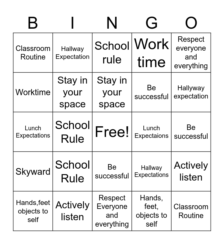 This bingo card has a free space and 24 words: School Rule, Actively listen, Stay in your space, Hands,feet objects to self, Respect everyone and everything, Classroom Routine, Worktime, Hallway Expectation, Lunch Expectaions, Be successful, Be successful, Lunch Expectations, Hallway Expectations, Actively listen, Stay in your space, Hands, feet, objects to self, Be successful, School rule, Hallyway expectation, School Rule, Classroom Routine, Skyward, Work time and Respect Everyone and everything.