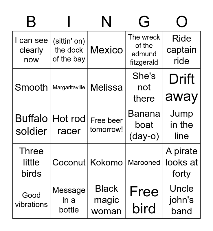 This bingo card has a free space and 39 words: Jessica, Surfin USA, One love / people get ready, Margaritaville, Good vibrations, Kokomo, Melissa, All around, Ride captain ride, Three little birds, Hot rod racer, The wreck of the edmund fitzgerald, Uncle john's band, Jump in the line, Banana boat (day-o), Coconut, Somewhere over the rainbow, I can see clearly now, Sweet home alabama, Marooned, Smooth, Black magic woman, She's not there, Drift away, Little green bag, Ocean man, Summer breeze, Escape (the pina colada song), Island girl, (sittin' on) the dock of the bay, Brandy (you're a fine girl), Sundown, Mexico, Message in a bottle, Free bird, Down under, A pirate looks at forty, Buffalo soldier and Lola.