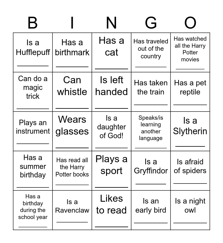 This bingo card has a free space and 24 words: Has read all the Harry Potter books __________, Is a Ravenclaw ________, Is left handed ______, Has a birthday during the school year _________, Has watched all the Harry Potter movies _________, Is a Hufflepuff _______, Can do a magic trick ________, Has a birthmark _______, Speaks/is learning another language __________, Plays a sport ______, Has taken the train ________, Plays an instrument ________, Is a Gryffindor _______, Is afraid of spiders ________, Can whistle ______, Is an early bird ________, Is a Slytherin ______, Has a cat ______, Has a pet reptile ________, Wears glasses ______, Is a night owl ________, Has a summer birthday ________, Has traveled out of the country _________ and Likes to read ______.