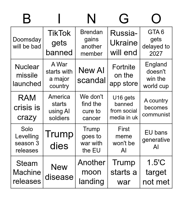 This bingo card has a free space and 24 words: Trump dies, New disease, New AI scandal, Steam Machine releases, GTA 6 gets delayed to 2027, Doomsday will be bad, Nuclear missile launched, TikTok gets banned, U16 gets banned from social media in uk, Trump goes to war with the EU, Fortnite on the app store, RAM crisis is crazy, First meme won't be AI, EU bans generative AI, A War starts with a major country, Trump starts a war, A country becomes communist, Brendan gains another member, England doesn't win the world cup, America starts using AI soldiers, 1.5'C target not met, Solo Levelling season 3 releases, Russia-Ukraine will end and Another moon landing.