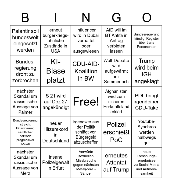 This bingo card has a free space and 24 words: neuer Hitzerekord in Deutschland, insane Polizeigewalt in Erfurt, CDU-AfD-Koalition in BW, nächster Skandal um rassistische Aussage von Merz, Bundesregierung kündigt Register über trans Personen an, Palantir soll bundesweit eingesetzt werden, Bundes-regierung droht zu zerbrechen, erneut bürgerkriegs-ähnliche Zustände in USA, Afghanistan wird zum sicheren Herkunftsland erklärt, irgendwer aus der Politik schlägt vor, Bürgergeld abzuschaffen, Wolf-Debatte wird aufgewärmt im Sommerloch, nächster Skandal um rassistische Aussage von Palmer, Polizei erschießt PoC, Youtube-Synchros werden halbwegs gut, KI-Blase platzt, erneutes Attentat auf Trump, PDL bringt irgendeinen CDU-Take, Influencer wird in Dubai verhaftet oder ausgewiesen, Trump wird beim IGH angeklagt, S 21 wird auf Dez 27 angekündigt, neue Forschungs-ergebnisse zu Social Media und Aufmerk-samkeit, Bundesregierung streicht Finanzierung sämtlicher politisch progressiver NGOs, AfD will im BT Antifa in Antrag verbieten lassen and Vorwürfe sexuellen Missbrauchs gegen nächsten Metal(core)-Sänger.