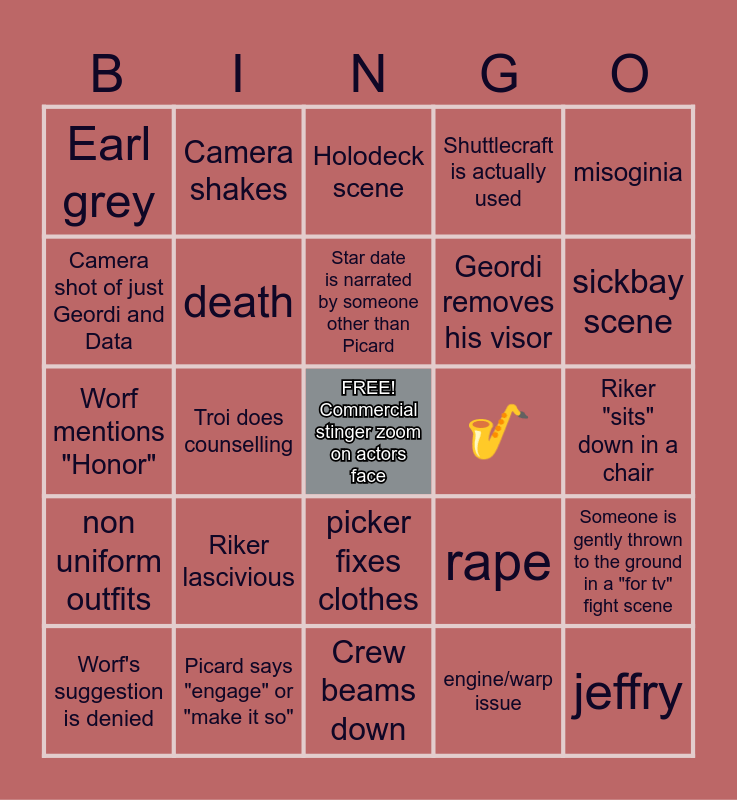This bingo card has a free space and 24 words: Riker lascivious, Picard says "engage" or "make it so", Star date is narrated by someone other than Picard, Worf's suggestion is denied, misoginia, Earl grey, Camera shot of just Geordi and Data, Camera shakes, 🎷, picker fixes clothes, Geordi removes his visor, Worf mentions "Honor", rape, Someone is gently thrown to the ground in a "for tv" fight scene, death, engine/warp issue, Riker "sits" down in a chair, Holodeck scene, sickbay scene, Troi does counselling, jeffry, non uniform outfits, Shuttlecraft is actually used and Crew beams down.