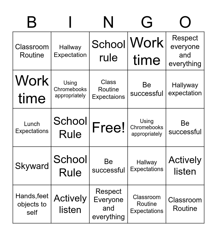 This bingo card has a free space and 24 words: School Rule, Actively listen, Class Routine Expectaions, Hands,feet objects to self, Respect everyone and everything, Classroom Routine, Work time, Hallway Expectation, Using Chromebooks appropriately, Be successful, Be successful, Lunch Expectations, Hallway Expectations, Actively listen, Using Chromebooks appropriately, Classroom Routine Expectations, Be successful, School rule, Hallyway expectation, School Rule, Classroom Routine, Skyward, Work time and Respect Everyone and everything.