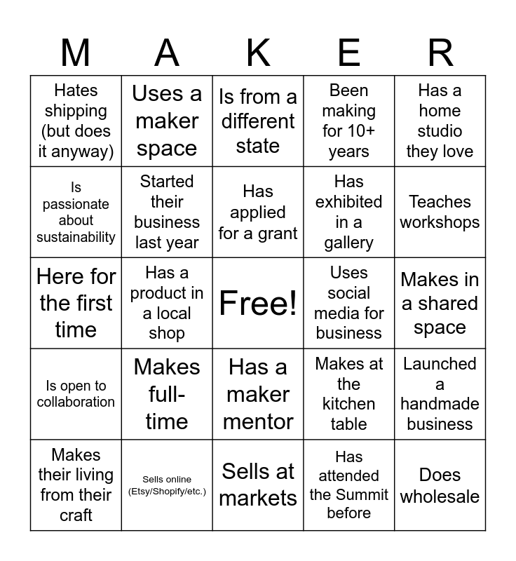This bingo card has a free space and 28 words: Launched a handmade business, Made something this week, Has exhibited in a gallery, Has attended the Summit before, Is passionate about sustainability, Is from a different state, Uses a maker space, Is open to collaboration, Uses social media for business, Makes their living from their craft, Here for the first time, Been making for 10+ years, Sells online (Etsy/Shopify/etc.), Sells at markets, Teaches workshops, Uses a maker space, Makes full-time, Started their business last year, Has applied for a grant, Has a maker mentor, Hates shipping (but does it anyway), Does custom orders, Does wholesale, Has a product in a local shop, Makes in a shared space, Makes at the kitchen table, Has a home studio they love and Wants more studio space.