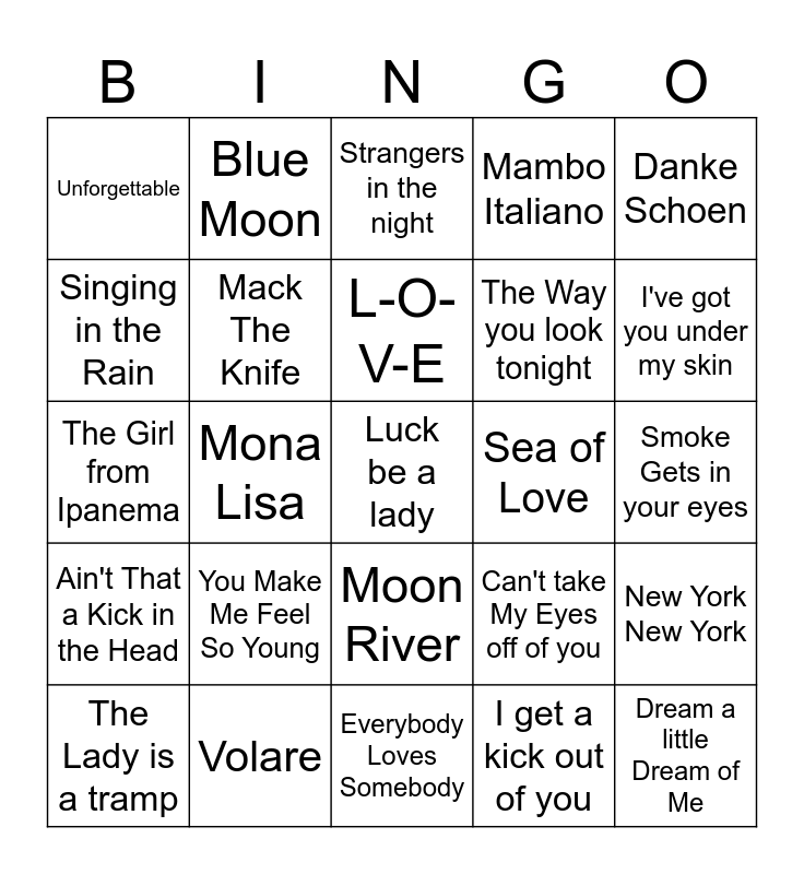 This bingo card has 36 words: Come Fly With Me, That's Amore, You're Nobody Till Somebody Loves You, Mack The Knife, Can't take My Eyes off of you, Ain't That a Kick in the Head, L-O-V-E, Beyond the Sea, Danke Schoen, Fly MeTo the Moon, Mona Lisa, Mambo Italiano, Blue Velvet, Sea of Love, I've got you under my skin, Unforgettable, Dream a little Dream of Me, You Make Me Feel So Young, Luck be a lady, Strangers in the night, Smoke Gets in your eyes, New York New York, Volare, The Lady is a tramp, Everybody Loves Somebody, Blue Moon, The Girl from Ipanema, Uncahined Melody, The Way you look tonight, Singing in the Rain, Chances Are, Que Sera, Sera, I get a kick out of you, Moon River, I'll BeSeeing you and Just the Way You Are.