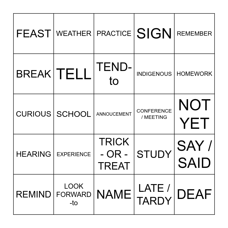 This bingo card has a free space and 24 words: EXPERIENCE, LOOK FORWARD -to, TEND-to, REMIND, REMEMBER, FEAST, BREAK, WEATHER, CONFERENCE / MEETING, TRICK - OR - TREAT, INDIGENOUS, CURIOUS, STUDY, SAY / SAID, TELL, LATE / TARDY, NOT YET, PRACTICE, HOMEWORK, SCHOOL, DEAF, HEARING, SIGN and NAME.