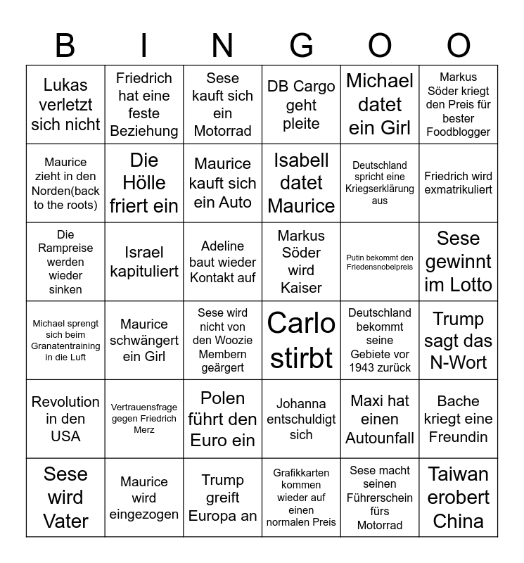 This bingo card has 36 words: Johanna entschuldigt sich, Polen führt den Euro ein, Grafikkarten kommen wieder auf einen normalen Preis, Maurice zieht in den Norden(back to the roots), Michael sprengt sich beim Granatentraining in die Luft, Markus Söder wird Kaiser, Die Hölle friert ein, Trump greift Europa an, Michael datet ein Girl, Maxi hat einen Autounfall, Friedrich wird exmatrikuliert, DB Cargo geht pleite, Bache kriegt eine Freundin, Israel kapituliert, Isabell datet Maurice, Lukas verletzt sich nicht, Revolution in den USA, Putin bekommt den Friedensnobelpreis, Die Rampreise werden wieder sinken, Sese kauft sich ein Motorrad, Adeline baut wieder Kontakt auf, Maurice schwängert ein Girl, Carlo stirbt, Sese wird nicht von den Woozie Membern geärgert, Deutschland bekommt seine Gebiete vor 1943 zurück, Friedrich hat eine feste Beziehung, Deutschland spricht eine Kriegserklärung aus, Maurice wird eingezogen, Maurice kauft sich ein Auto, Markus Söder kriegt den Preis für bester Foodblogger, Taiwan erobert China, Sese wird Vater, Trump sagt das N-Wort, Sese gewinnt im Lotto, Vertrauensfrage gegen Friedrich Merz and Sese macht seinen Führerschein fürs Motorrad.