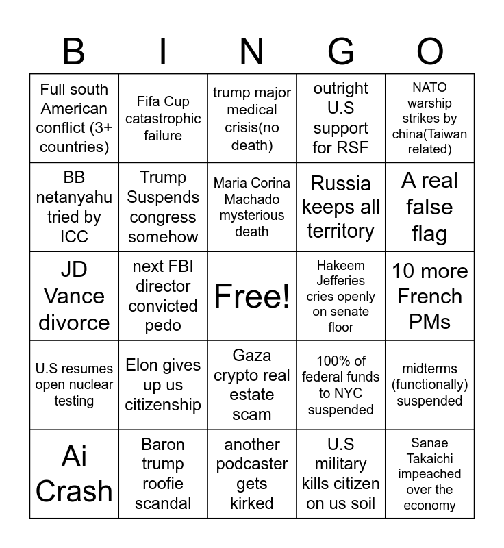 This bingo card has a free space and 24 words: Elon gives up us citizenship, Baron trump roofie scandal, Maria Corina Machado mysterious death, Ai Crash, NATO warship strikes by china(Taiwan related), Full south American conflict (3+ countries), BB netanyahu tried by ICC, Fifa Cup catastrophic failure, Hakeem Jefferies cries openly on senate floor, Gaza crypto real estate scam, Russia keeps all territory, JD Vance divorce, 100% of federal funds to NYC suspended, midterms (functionally) suspended, Trump Suspends congress somehow, U.S military kills citizen on us soil, 10 more French PMs, trump major medical crisis(no death), A real false flag, next FBI director convicted pedo, Sanae Takaichi impeached over the economy, U.S resumes open nuclear testing, outright U.S support for RSF and another podcaster gets kirked.