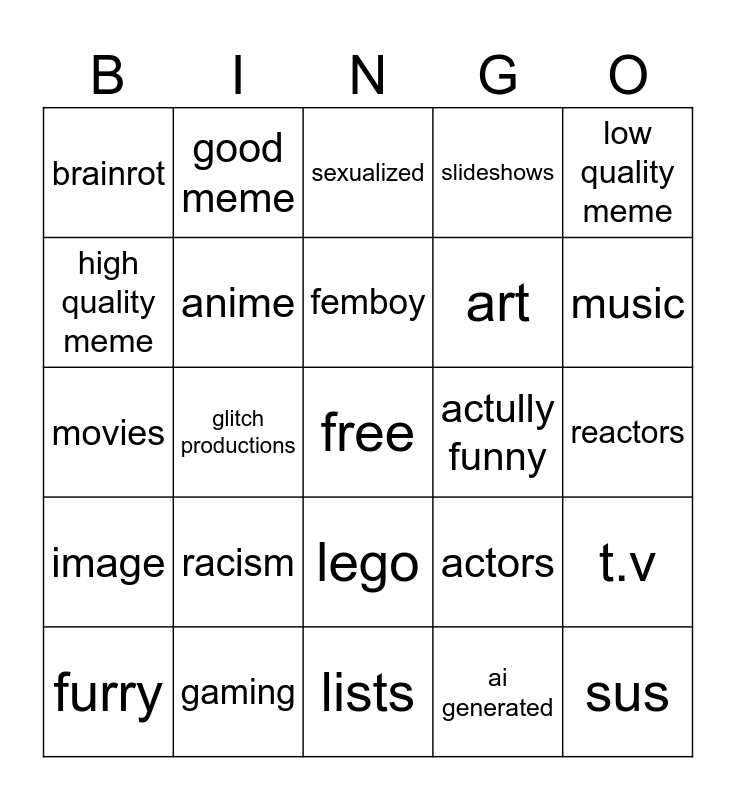 This bingo card has a free space and 24 words: racism, gaming, femboy, furry, low quality meme, brainrot, high quality meme, good meme, actully funny, lego, art, movies, actors, t.v, anime, ai generated, reactors, sexualized, music, glitch productions, sus, image, slideshows and lists.