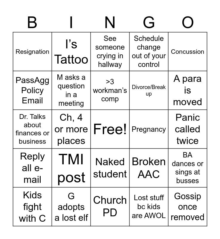 This bingo card has a free space and 24 words: TMI post, G adopts a lost elf, >3 workman’s comp, Kids fight with C, Concussion, Resignation, PassAgg Policy Email, I’s Tattoo, Pregnancy, Naked student, Divorce/Break up, Dr. Talks about finances or business, Broken AAC, BA dances or sings at busses, M asks a question in a meeting, Lost stuff bc kids are AWOL, Panic called twice, See someone crying in hallway, A para is moved, Ch, 4 or more places, Gossip once removed, Reply all e-mail, Schedule change out of your control and Church PD.