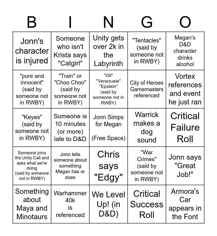 This bingo card has a free space and 24 words: Jonn tells someone about something Megan has or does, Warhammer 40k is referenced, "Oil" "Venezuela" "Epstein" (said by someone not in RWBY), Something about Maya and Minotaurs, Megan's D&D character drinks alcohol, Jonn's character is injured, "pure and innocent" (said by someone not in RWBY), Someone who isn't Krista says "Catgirl", Warrick makes a dog sound, Chris says "Edgy", City of Heroes Gamemasters referenced, "Keyes" (said by someone not in RWBY), "War Crimes" (said by someone not in RWBY), Jonn says "Great Job!", "Train" or "Choo Choo" (said by someone not in RWBY), Critical Success Roll, Critical Failure Roll, Unity gets over 2k in the Labyrinth, Vortex references and event he just ran, Someone is 10 minutes (or more) late to D&D, Armora's Car appears in the Font, Someone joins the Unity Call and asks what we're doing (said by someone not in RWBY), "Tentacles" (said by someone not in RWBY) and We Level Up! (in D&D).