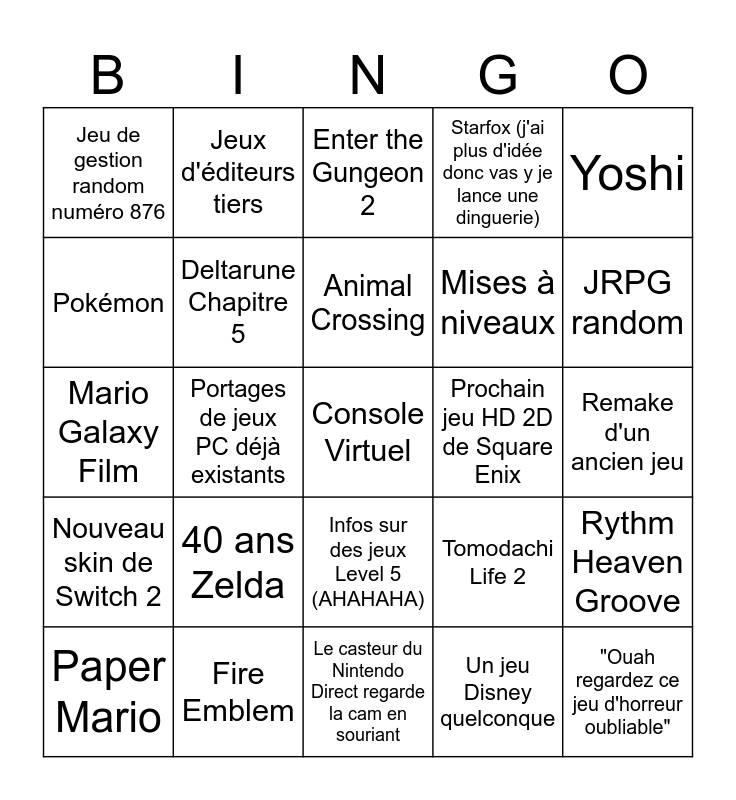 This bingo card has a free space and 24 words: 40 ans Zelda, Fire Emblem, Animal Crossing, Paper Mario, Yoshi, Jeu de gestion random numéro 876, Pokémon, Jeux d'éditeurs tiers, Prochain jeu HD 2D de Square Enix, Infos sur des jeux Level 5 (AHAHAHA), Mises à niveaux, Mario Galaxy Film, Tomodachi Life 2, Rythm Heaven Groove, Deltarune Chapitre 5, Un jeu Disney quelconque, Remake d'un ancien jeu, Enter the Gungeon 2, JRPG random, Portages de jeux PC déjà existants, "Ouah regardez ce jeu d'horreur oubliable", Nouveau skin de Switch 2, Starfox (j'ai plus d'idée donc vas y je lance une dinguerie) and Le casteur du Nintendo Direct regarde la cam en souriant.