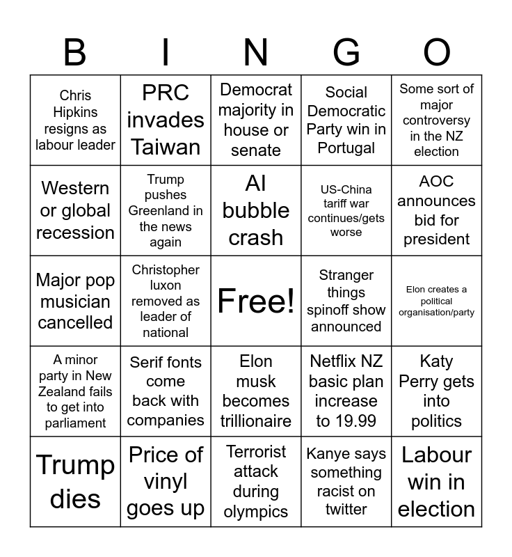 This bingo card has a free space and 24 words: Serif fonts come back with companies, Price of vinyl goes up, AI bubble crash, Trump dies, Some sort of major controversy in the NZ election, Chris Hipkins resigns as labour leader, Western or global recession, PRC invades Taiwan, Stranger things spinoff show announced, Elon musk becomes trillionaire, US-China tariff war continues/gets worse, Major pop musician cancelled, Netflix NZ basic plan increase to 19.99, Katy Perry gets into politics, Trump pushes Greenland in the news again, Kanye says something racist on twitter, Elon creates a political organisation/party, Democrat majority in house or senate, AOC announces bid for president, Christopher luxon removed as leader of national, Labour win in election, A minor party in New Zealand fails to get into parliament, Social Democratic Party win in Portugal and Terrorist attack during olympics.