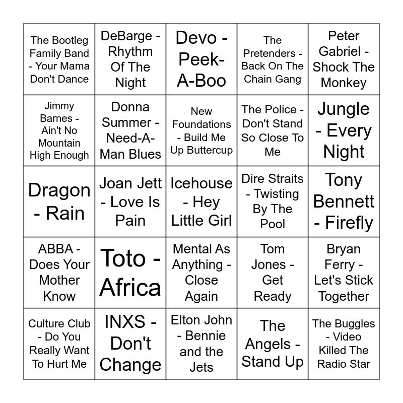 This bingo card has 44 words: Blancmange - Living On The Ceiling, Icehouse - Hey Little Girl, The Psychedelic Furs - Love My Way, Culture Club - Do You Really Want To Hurt Me, Dexys Midnight Runners - Jackie Wilson Said, The Angels - Stand Up, Devo - Peek-A-Boo, Laura Branigan - Gloria, Peter Gabriel - Shock The Monkey, INXS - Don't Change, The Pretenders - Back On The Chain Gang, Dire Straits - Twisting By The Pool, Mental As Anything - Close Again, Toto - Africa, Bang the Drum - Passion, Elton John - Bennie and the Jets, Elton John - Honky Cat, Dragon - Rain, Confidence Man - Toy Boy, Jungle - Every Night, DeBarge - Rhythm Of The Night, The Beatles - Love Me Do, Girl Overboard - The Love We Make, The Bootleg Family Band - Your Mama Don't Dance, Taco - Cheek To Cheek, Tony Bennett - Firefly, Redbone - Wovoka, Ray Parker Jr. - Ghostbusters, Tom Jones - Get Ready, ABBA - Does Your Mother Know, Jamiroquai - Seven Days In Sunny June, Bryan Ferry - Let's Stick Together, Glenn Frey - The Heat Is On, Adam Ant - Goody Two Shoes, Joan Jett - Love Is Pain, The Bangles - Walk Like An Egyptian, Survivor - Eye of the Tiger, The Buggles - Video Killed The Radio Star, New Foundations - Build Me Up Buttercup, Jimmy Barnes - Ain't No Mountain High Enough, The Police - Don't Stand So Close To Me, Enya - Orinoco Flow, Donna Summer - Need-A-Man Blues and Kylie Minogue - Locomotion.