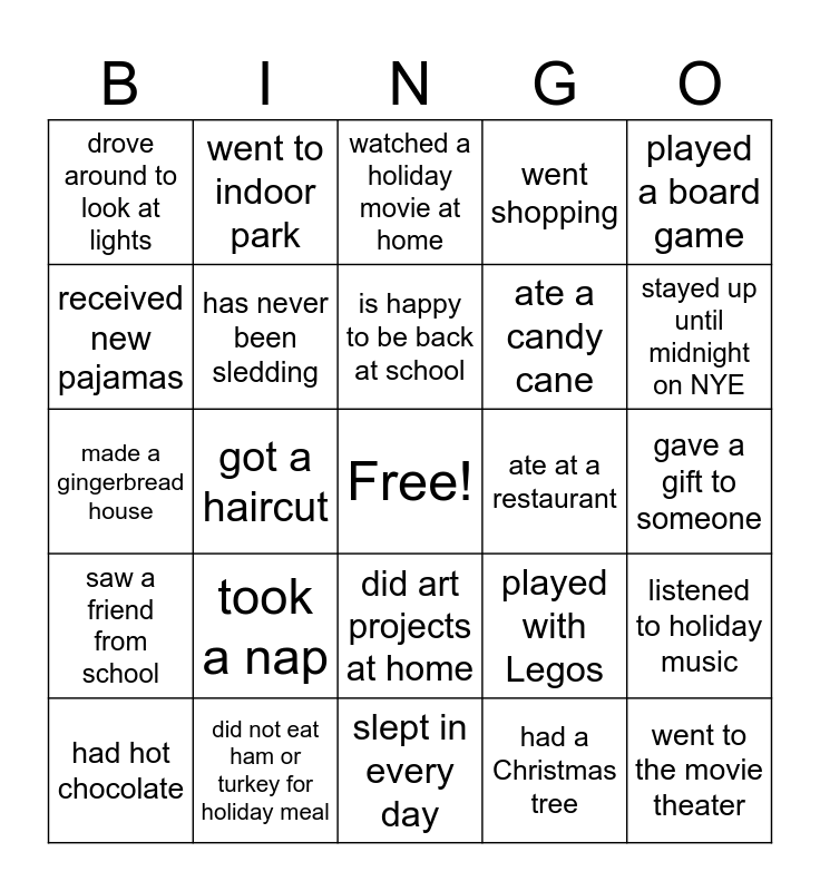 This bingo card has a free space and 24 words: took a nap, did not eat ham or turkey for holiday meal, is happy to be back at school, had hot chocolate, played a board game, drove around to look at lights, received new pajamas, went to indoor park, ate at a restaurant, did art projects at home, ate a candy cane, made a gingerbread house, played with Legos, listened to holiday music, has never been sledding, had a Christmas tree, gave a gift to someone, watched a holiday movie at home, stayed up until midnight on NYE, got a haircut, went to the movie theater, saw a friend from school, went shopping and slept in every day.
