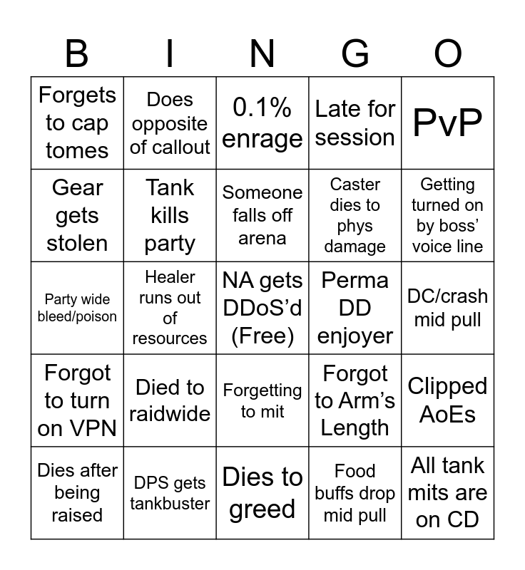 This bingo card has a free space and 24 words: Died to raidwide, DPS gets tankbuster, Someone falls off arena, Dies after being raised, PvP, Forgets to cap tomes, Gear gets stolen, Does opposite of callout, Perma DD enjoyer, Forgetting to mit, Caster dies to phys damage, Party wide bleed/poison, Forgot to Arm’s Length, Clipped AoEs, Tank kills party, Food buffs drop mid pull, DC/crash mid pull, 0.1% enrage, Getting turned on by boss’ voice line, Healer runs out of resources, All tank mits are on CD, Forgot to turn on VPN, Late for session and Dies to greed.
