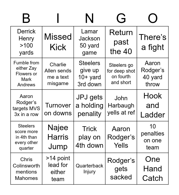 This bingo card has 25 words: Najee Harris Jump, Quarterback Injury, Steelers give up 10+ yard 3rd down, Chris Colinsworth mentions Mahomes, There’s a fight, Derrick Henry >100 yards, Fumble from either Zay Flowers or Mark Andrews, Missed Kick, John Harbaugh yells at ref, Trick play on 4th down, Steelers go for deep shot on fourth and short, Aaron Rodger’s targets MVS 3x in a row, Aaron Rodger’s Yells, 10 penalties on one team, Charlie Allen sends me a text misgame, One Hand Catch, Hook and Ladder, Lamar Jackson 50 yard game, Aaron Rodger’s 40 yard throw, Turnover on downs, JPJ gets a holding penality, >14 point lead for either team, Steelers score more in 4th than every other quarter, Return past the 40 and Rodger’s gets sacked.