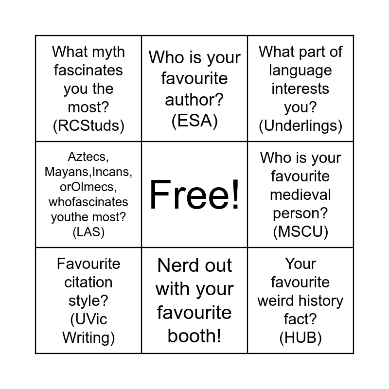 This bingo card has a free space and 8 words: Who is your favourite medieval person? (MSCU), What part of language interests you? (Underlings), Who is your favourite author? (ESA), Favourite citation style? (UVic Writing), What myth fascinates you the most? (RCStuds), Your favourite weird history fact? (HUB), Aztecs, Mayans,Incans, orOlmecs, whofascinates youthe most?(LAS) and Nerd out with your favourite booth!.