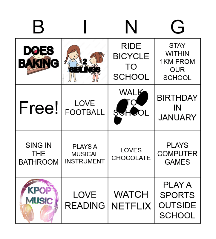 This bingo card has 4 images and 15 words: LOVE READING, PLAYS COMPUTER GAMES, RIDE BICYCLE TO SCHOOL, DOES BAKING, SING IN THE BATHROOM, 2 SIBLINGS, LOVES CHOCOLATE, WATCH NETFLIX, Free!, LOVE FOOTBALL, STAY WITHIN 1KM FROM OUR SCHOOL, PLAYS A MUSICAL INSTRUMENT, BIRTHDAY IN JANUARY, WALK TO SCHOOL and PLAY A SPORTS OUTSIDE SCHOOL.