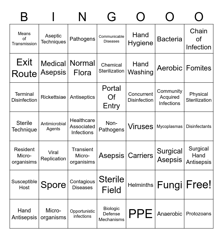 This bingo card has 50 words: Free!, Aerobic, Anaerobic, Antimicrobial Agents, Antiseptics, Asepsis, Aseptic Techniques, Biologic Defense Mechanisms, Bacteria, Carriers, Chain of Infection, Communicable Diseases, Community Acquired Infections, Concurrent Disinfection, Contagious Diseases, Disinfectants, Exit Route, Fomites, Hand Antisepsis, Hand Hygiene, Hand Washing, Healthcare Associated Infections, Means of Transmission, Medical Asepsis, Micro-organisms, Non-Pathogens, Normal Flora, Opportunistic infections, Pathogens, Portal Of Entry, Reservoir, Resident Micro-organisims, Spore, Sterile Field, Sterile Technique, Mycoplasmas, Surgical Asepsis, Surgical Hand Antisepsis, Susceptible Host, Terminal Disinfection, Transient Micro-organisims, Helminths, Viral Replication, PPE, Physical Sterilization, Chemical Sterilization, Viruses, Fungi, Rickettsiae and Protozoans.