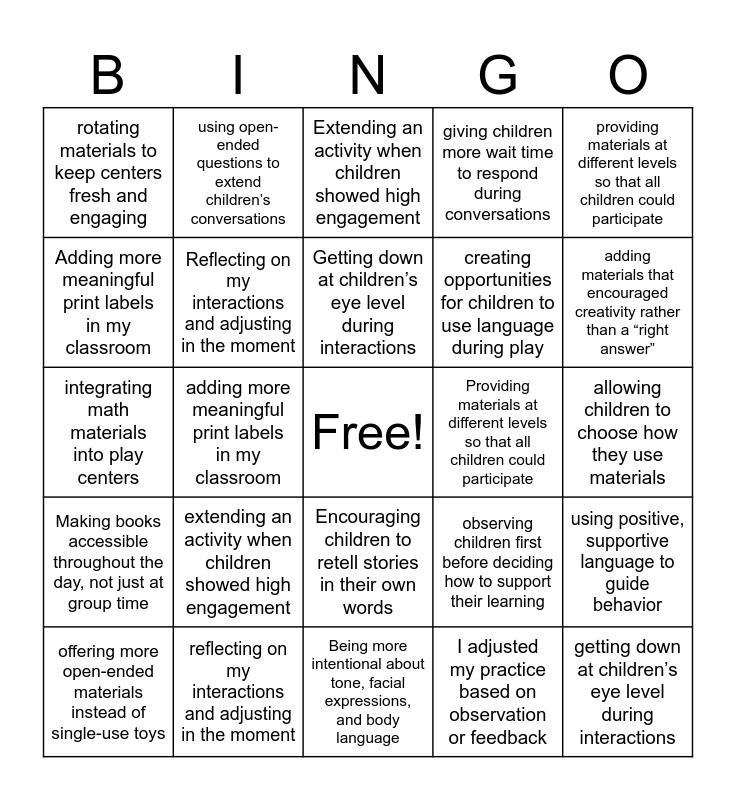 This bingo card has a free space and 72 words: intentionally modeling new vocabulary during daily routines, using open-ended questions to extend children’s conversations, adding more meaningful print labels in my classroom, reading the same book multiple times to deepen comprehension, encouraging children to retell stories in their own words, incorporating songs, rhymes, or fingerplays to support language development, giving children more wait time to respond during conversations, expanding children’s language by repeating and adding detail to what they said, creating opportunities for children to use language during play, making books accessible throughout the day, not just at group time, offering more open-ended materials instead of single-use toys, adjusting learning centers based on children’s interests, adding materials that encouraged creativity rather than a “right answer”, rotating materials to keep centers fresh and engaging, integrating literacy materials into play centers, integrating math materials into play centers, observing children first before deciding how to support their learning, providing materials at different levels so that all children could participate, intentionally planning activities that supported exploration and problem solving, allowing children to choose how they use materials, extending an activity when children showed high engagement, getting down at children’s eye level during interactions, using positive, supportive language to guide behavior, acknowledging children’s feelings before redirecting behavior, engaging in sustained back-and-forth interactions during play, supporting peer interactions instead of immediately stepping in, modeling respectful language during conflicts, being more intentional about tone, facial expressions, and body language, narrating children’s play to support understanding and engagement, encouraging children to solve problems with peers, reflecting on my interactions and adjusting in the moment, I tried something new even when it felt uncomfortable, I learned from something that didn’t go as planned, I collaborated with a colleague to improve practice, I adjusted my practice based on observation or feedback, I was proud of the growth in my classroom, Intentionally modeling new vocabulary during daily routines, Using open-ended questions to extend children’s conversations, Adding more meaningful print labels in my classroom, Reading the same book multiple times to deepen comprehension, Encouraging children to retell stories in their own words, Incorporating songs, rhymes, or fingerplays to support language development, Giving children more wait time to respond during conversations, Expanding children’s language by repeating and adding detail to what they said, Creating opportunities for children to use language during play, Making books accessible throughout the day, not just at group time, Offering more open-ended materials instead of single-use toys, Adjusting learning centers based on children’s interests, Adding materials that encouraged creativity rather than a “right answer”, Rotating materials to keep centers fresh and engaging, Integrating literacy materials into play centers, Integrating math materials into play centers, Observing children first before deciding how to support their learning, Providing materials at different levels so that all children could participate, Intentionally planning activities that supported exploration and problem solving, Allowing children to choose how they use materials, Extending an activity when children showed high engagement, Getting down at children’s eye level during interactions, Using positive, supportive language to guide behavior, Acknowledging children’s feelings before redirecting behavior, Engaging in sustained back-and-forth interactions during play, Supporting peer interactions instead of immediately stepping in, Modeling respectful language during conflicts, Being more intentional about tone, facial expressions, and body language, Narrating children’s play to support understanding and engagement, Encouraging children to solve problems with peers, Reflecting on my interactions and adjusting in the moment, I tried something new even when it felt uncomfortable, I learned from something that didn’t go as planned, I collaborated with a colleague to improve practice, I adjusted my practice based on observation or feedback and I was proud of the growth in my classroom.