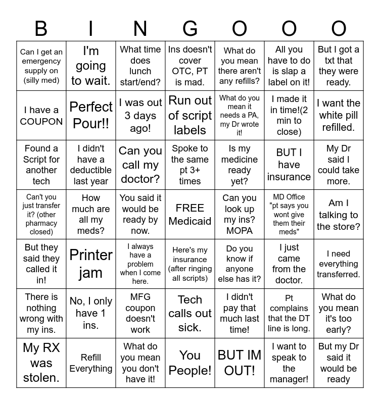 This bingo card has a free space and 52 words: Refill Everything, I made it in time!(2 min to close), Is ___ working?, How much are all my meds?, Can you call my doctor?, I just came from the doctor., I'm going to wait., I want to speak to the manager!, All you have to do is slap a label on it!, I need everything transferred., But I got a txt that they were ready., Here's my insurance (after ringing all scripts), BUT I have insurance, Is my medicine ready yet?, I didn't pay that much last time!, I always have a problem when I come here., I have a COUPON, I want the white pill refilled., What do you mean you don't have it!, What do you mean there aren't any refills?, What do you mean it needs a PA, my Dr wrote it!, You said it would be ready by now., Can I get an emergency supply on (silly med), Perfect Pour!!, You People!, But my Dr said it would be ready, Am I talking to the store?, BUT IM OUT!, I was out 3 days ago!, MD Office "pt says you wont give them their meds", Pt asks for the "little red ones" PSE, Ins doesn't cover OTC, PT is mad., Tech calls out sick., Pt complains that the DT line is long., But they said they called it in!, What time does lunch start/end?, Can't you just transfer it? (other pharmacy closed), Do you know if anyone else has it?, There is nothing wrong with my ins., No, I only have 1 ins., MFG coupon doesn't work, Found a Script for another tech, I didn't have a deductible last year, Register stops working, Spoke to the same pt 3+ times, Can you look up my ins? MOPA, Printer jam, Run out of script labels, What do you mean it's too early?, My RX was stolen., My Dr said I could take more. and I have never had a copay..