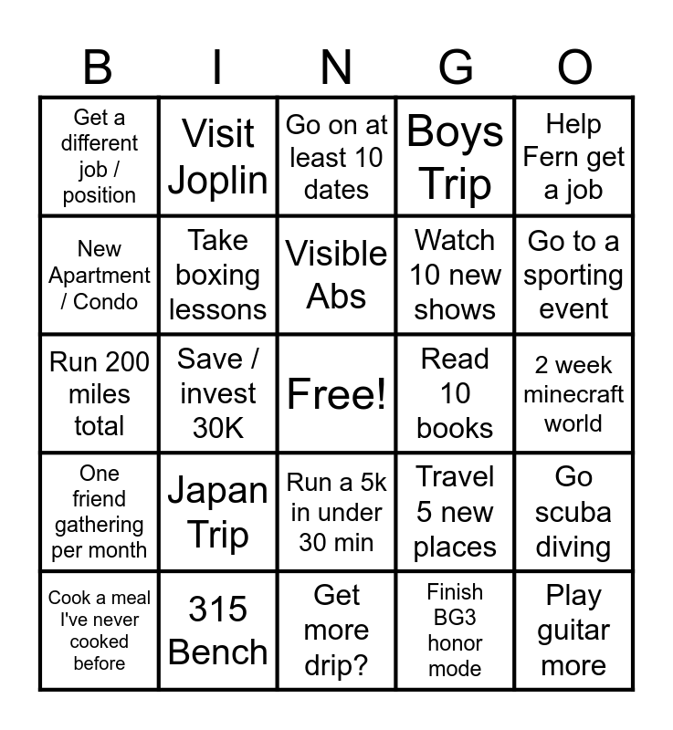 This bingo card has a free space and 24 words: Japan Trip, 315 Bench, Visible Abs, Cook a meal I've never cooked before, Help Fern get a job, Get a different job / position, New Apartment / Condo, Visit Joplin, Read 10 books, Run a 5k in under 30 min, Watch 10 new shows, Run 200 miles total, Travel 5 new places, Go scuba diving, Take boxing lessons, Finish BG3 honor mode, 2 week minecraft world, Go on at least 10 dates, Go to a sporting event, Save / invest 30K, Play guitar more, One friend gathering per month, Boys Trip and Get more drip?.