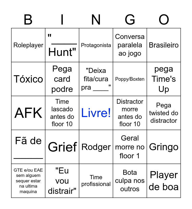 This bingo card has a free space and 24 words: Grief, "Eu vou distrair", "Deixa fita/cura pra ____", GTE e/ou EAE sem alguem sequer estar na ultima maquina, Brasileiro, Roleplayer, Tóxico, "____ Hunt", Distractor morre antes do floor 10, Rodger, Poppy/Boxten, AFK, Geral morre no floor 1, Gringo, Pega card podre, Bota culpa nos outros, Pega twisted do distractor, Protagonista, pega Time's Up, Time lascado antes do floor 10, Player de boa, Fã de _____, Conversa paralela ao jogo and Time profissional.