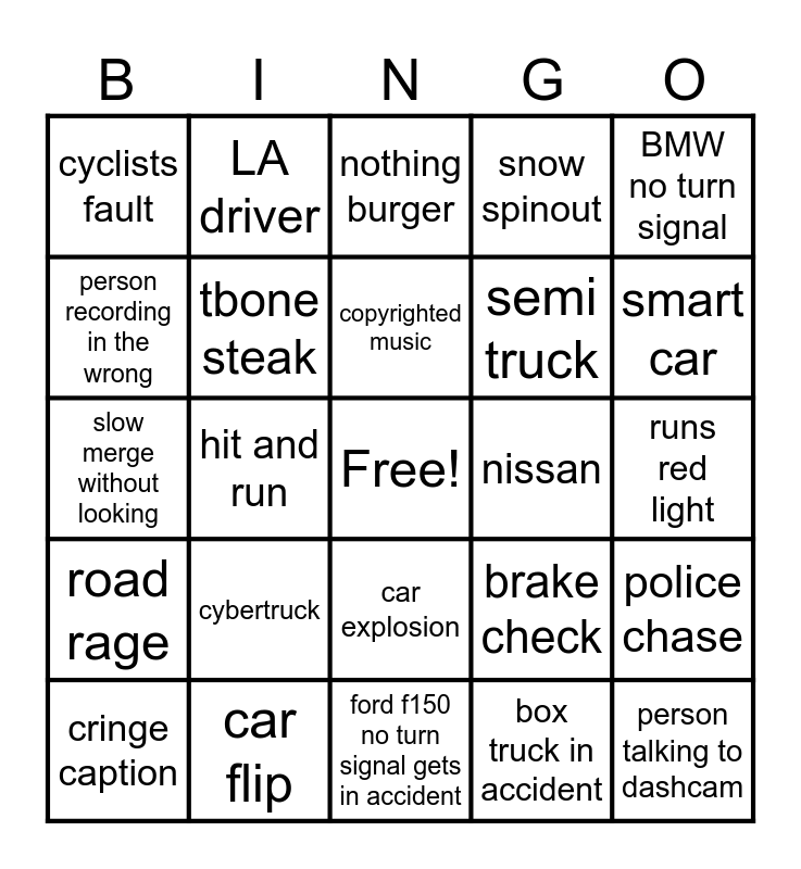 This bingo card has a free space and 24 words: cybertruck, car flip, copyrighted music, cringe caption, BMW no turn signal, cyclists fault, person recording in the wrong, LA driver, nissan, car explosion, semi truck, slow merge without looking, brake check, police chase, tbone steak, box truck in accident, runs red light, nothing burger, smart car, hit and run, person talking to dashcam, road rage, snow spinout and ford f150 no turn signal gets in accident.