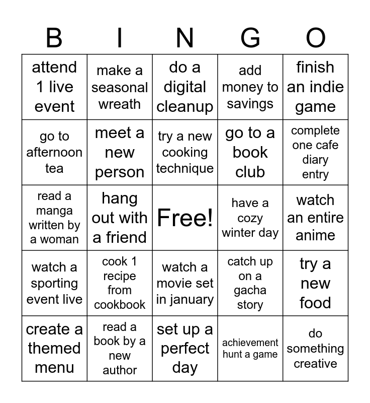 This bingo card has a free space and 24 words: cook 1 recipe from cookbook, read a book by a new author, try a new cooking technique, create a themed menu, finish an indie game, attend 1 live event, go to afternoon tea, make a seasonal wreath, have a cozy winter day, watch a movie set in january, go to a book club, read a manga written by a woman, catch up on a gacha story, try a new food, meet a new person, achievement hunt a game, watch an entire anime, do a digital cleanup, complete one cafe diary entry, hang out with a friend, do something creative, watch a sporting event live, add money to savings and set up a perfect day.