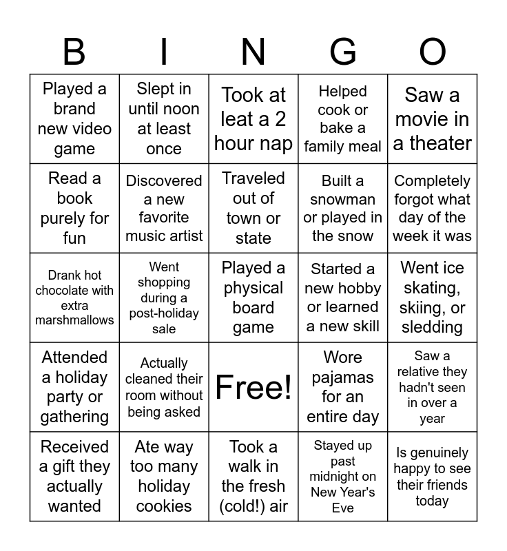 This bingo card has 26 words: Free!, Stayed up past midnight on New Year's Eve, Traveled out of town or state, Ate way too many holiday cookies, Saw a movie in a theater, Played a brand new video game, Read a book purely for fun, Slept in until noon at least once, Went ice skating, skiing, or sledding, Wore pajamas for an entire day, Built a snowman or played in the snow, Drank hot chocolate with extra marshmallows, Saw a relative they hadn't seen in over a year, Received a gift they actually wanted, Went shopping during a post-holiday sale, Finished an entire TV series in one sitting, Helped cook or bake a family meal, Attended a holiday party or gathering, Took at leat a 2 hour nap, Played a physical board game, Completely forgot what day of the week it was, Took a walk in the fresh (cold!) air, Started a new hobby or learned a new skill, Actually cleaned their room without being asked, Discovered a new favorite music artist and Is genuinely happy to see their friends today.