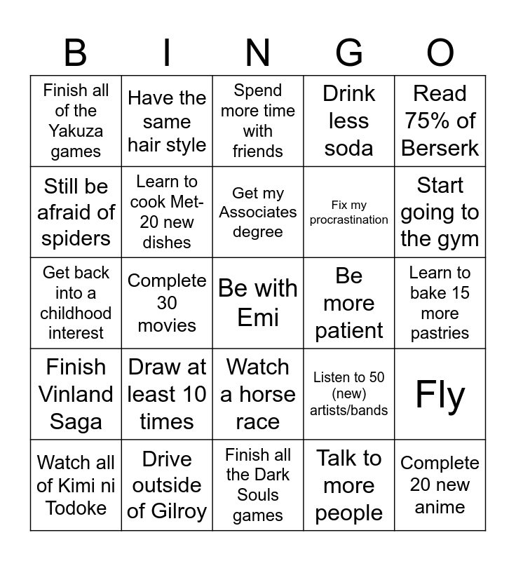 This bingo card has a free space and 24 words: Draw at least 10 times, Drive outside of Gilroy, Get my Associates degree, Watch all of Kimi ni Todoke, Read 75% of Berserk, Finish all of the Yakuza games, Still be afraid of spiders, Have the same hair style, Be more patient, Watch a horse race, Fix my procrastination, Get back into a childhood interest, Listen to 50 (new) artists/bands, Fly, Learn to cook Met- 20 new dishes, Talk to more people, Learn to bake 15 more pastries, Spend more time with friends, Start going to the gym, Complete 30 movies, Complete 20 new anime, Finish Vinland Saga, Drink less soda and Finish all the Dark Souls games.