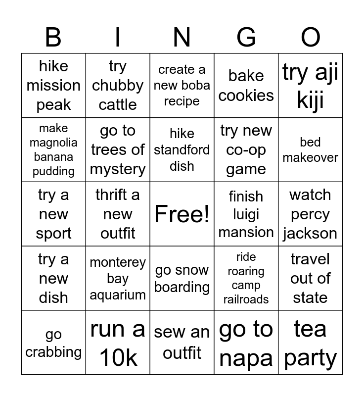 This bingo card has a free space and 24 words: monterey bay aquarium, run a 10k, hike standford dish, go crabbing, try aji kiji, hike mission peak, make magnolia banana pudding, try chubby cattle, finish luigi mansion, go snow boarding, try new co-op game, try a new sport, ride roaring camp railroads, travel out of state, go to trees of mystery, go to napa, watch percy jackson, create a new boba recipe, bed makeover, thrift a new outfit, tea party, try a new dish, bake cookies and sew an outfit.
