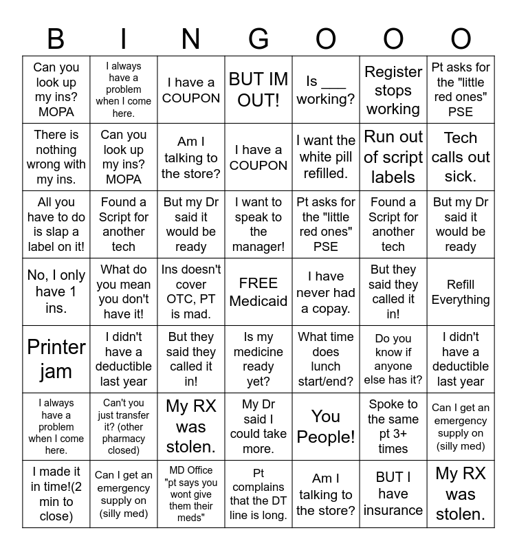 This bingo card has a free space and 104 words: Refill Everything, I made it in time!(2 min to close), Is ___ working?, How much are all my meds?, Can you call my doctor?, I just came from the doctor., I'm going to wait., I want to speak to the manager!, All you have to do is slap a label on it!, I need everything transferred., But I got a txt that they were ready., Here's my insurance (after ringing all scripts), BUT I have insurance, Is my medicine ready yet?, I didn't pay that much last time!, I always have a problem when I come here., I have a COUPON, I want the white pill refilled., What do you mean you don't have it!, What do you mean there aren't any refills?, What do you mean it needs a PA, my Dr wrote it!, You said it would be ready by now., Can I get an emergency supply on (silly med), Perfect Pour!!, You People!, But my Dr said it would be ready, Am I talking to the store?, BUT IM OUT!, I was out 3 days ago!, MD Office "pt says you wont give them their meds", Pt asks for the "little red ones" PSE, Ins doesn't cover OTC, PT is mad., Tech calls out sick., Pt complains that the DT line is long., But they said they called it in!, What time does lunch start/end?, Can't you just transfer it? (other pharmacy closed), Do you know if anyone else has it?, There is nothing wrong with my ins., No, I only have 1 ins., MFG coupon doesn't work, Found a Script for another tech, I didn't have a deductible last year, Register stops working, Spoke to the same pt 3+ times, Can you look up my ins? MOPA, Printer jam, Run out of script labels, What do you mean it's too early?, My RX was stolen., My Dr said I could take more., I have never had a copay., Refill Everything, I made it in time!(2 min to close), Is ___ working?, How much are all my meds?, Can you call my doctor?, I just came from the doctor., I'm going to wait., I want to speak to the manager!, All you have to do is slap a label on it!, I need everything transferred., But I got a txt that they were ready., Here's my insurance (after ringing all scripts), BUT I have insurance, Is my medicine ready yet?, I didn't pay that much last time!, I always have a problem when I come here., I have a COUPON, I want the white pill refilled., What do you mean you don't have it!, What do you mean there aren't any refills?, What do you mean it needs a PA, my Dr wrote it!, You said it would be ready by now., Can I get an emergency supply on (silly med), Perfect Pour!!, You People!, But my Dr said it would be ready, Am I talking to the store?, BUT IM OUT!, I was out 3 days ago!, MD Office "pt says you wont give them their meds", Pt asks for the "little red ones" PSE, Ins doesn't cover OTC, PT is mad., Tech calls out sick., Pt complains that the DT line is long., But they said they called it in!, What time does lunch start/end?, Can't you just transfer it? (other pharmacy closed), Do you know if anyone else has it?, There is nothing wrong with my ins., No, I only have 1 ins., MFG coupon doesn't work, Found a Script for another tech, I didn't have a deductible last year, Register stops working, Spoke to the same pt 3+ times, Can you look up my ins? MOPA, Printer jam, Run out of script labels, What do you mean it's too early?, My RX was stolen., My Dr said I could take more. and I have never had a copay..