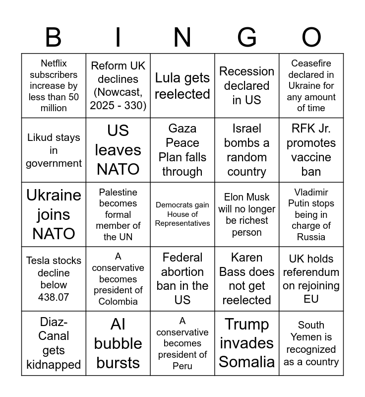 This bingo card has a free space and 24 words: A conservative becomes president of Colombia, AI bubble bursts, Gaza Peace Plan falls through, Diaz-Canal gets kidnapped, Ceasefire declared in Ukraine for any amount of time, Netflix subscribers increase by less than 50 million, Likud stays in government, Reform UK declines (Nowcast, 2025 - 330), Elon Musk will no longer be richest person, Federal abortion ban in the US, Israel bombs a random country, Ukraine joins NATO, Karen Bass does not get reelected, UK holds referendum on rejoining EU, US leaves NATO, Trump invades Somalia, Vladimir Putin stops being in charge of Russia, Lula gets reelected, RFK Jr. promotes vaccine ban, Palestine becomes formal member of the UN, South Yemen is recognized as a country, Tesla stocks decline below 438.07, Recession declared in US and A conservative becomes president of Peru.