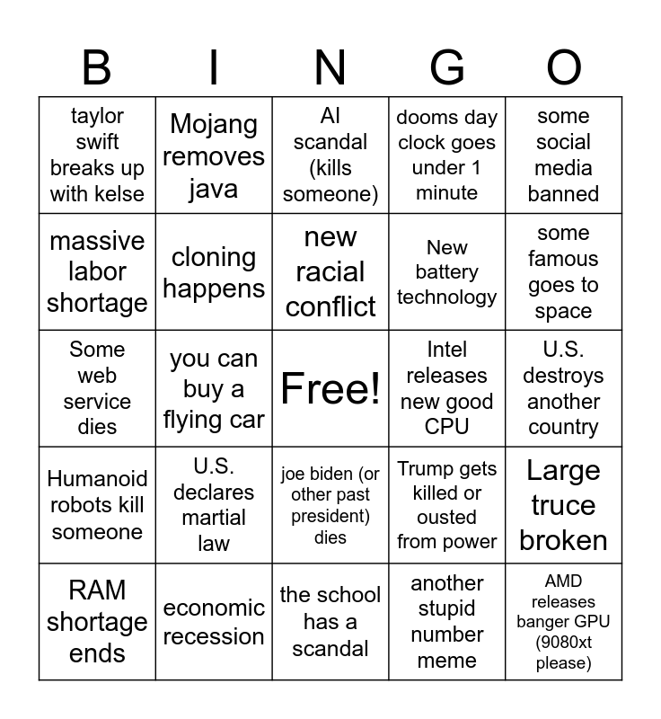 This bingo card has a free space and 24 words: U.S. declares martial law, economic recession, new racial conflict, RAM shortage ends, some social media banned, taylor swift breaks up with kelse, massive labor shortage, Mojang removes java, Intel releases new good CPU, joe biden (or other past president) dies, New battery technology, Some web service dies, Trump gets killed or ousted from power, Large truce broken, cloning happens, another stupid number meme, U.S. destroys another country, AI scandal (kills someone), some famous goes to space, you can buy a flying car, AMD releases banger GPU (9080xt please), Humanoid robots kill someone, dooms day clock goes under 1 minute and the school has a scandal.